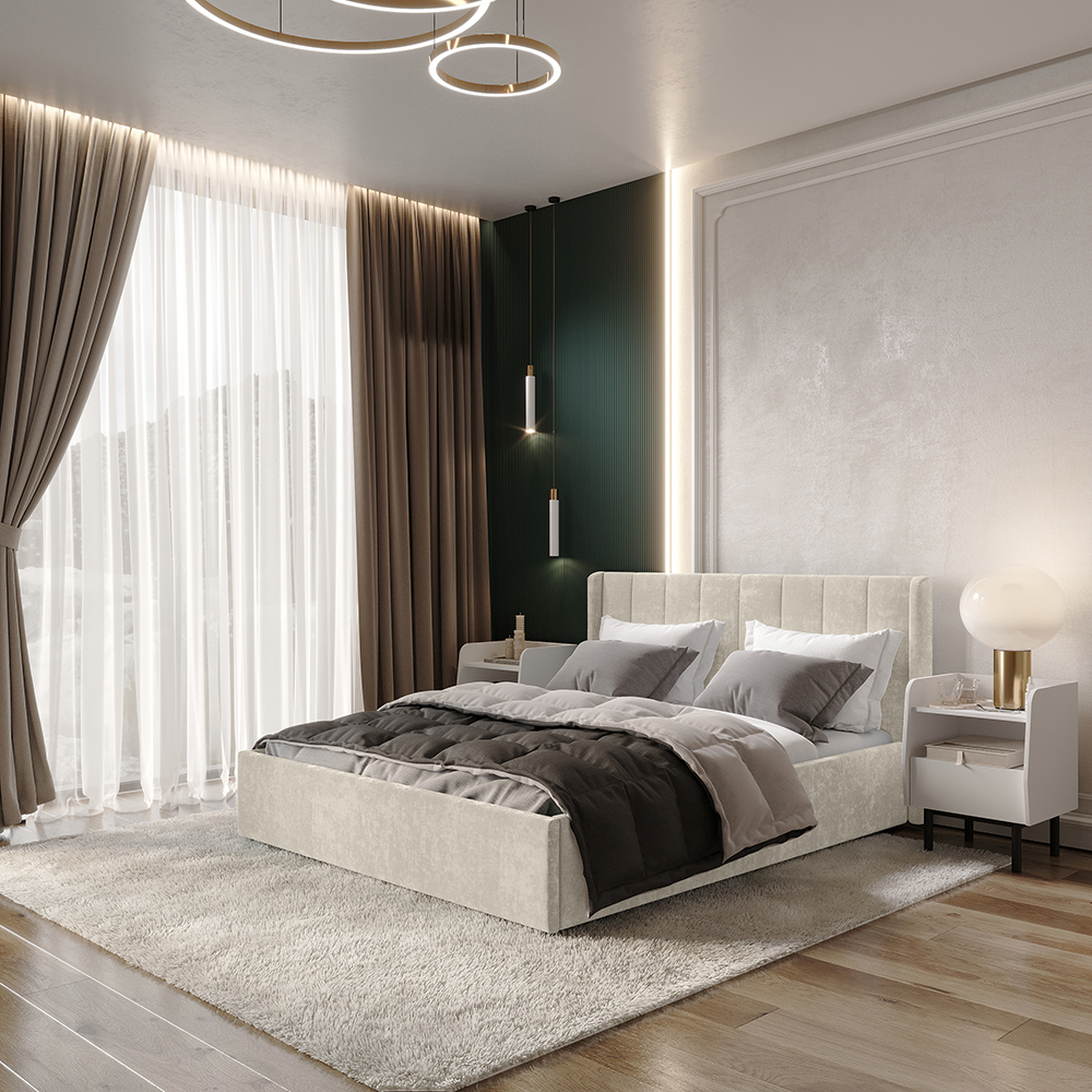 Материал мягких частей - велюр, задняя сторона - спанбонд серый. Декор изголовья - стежка.