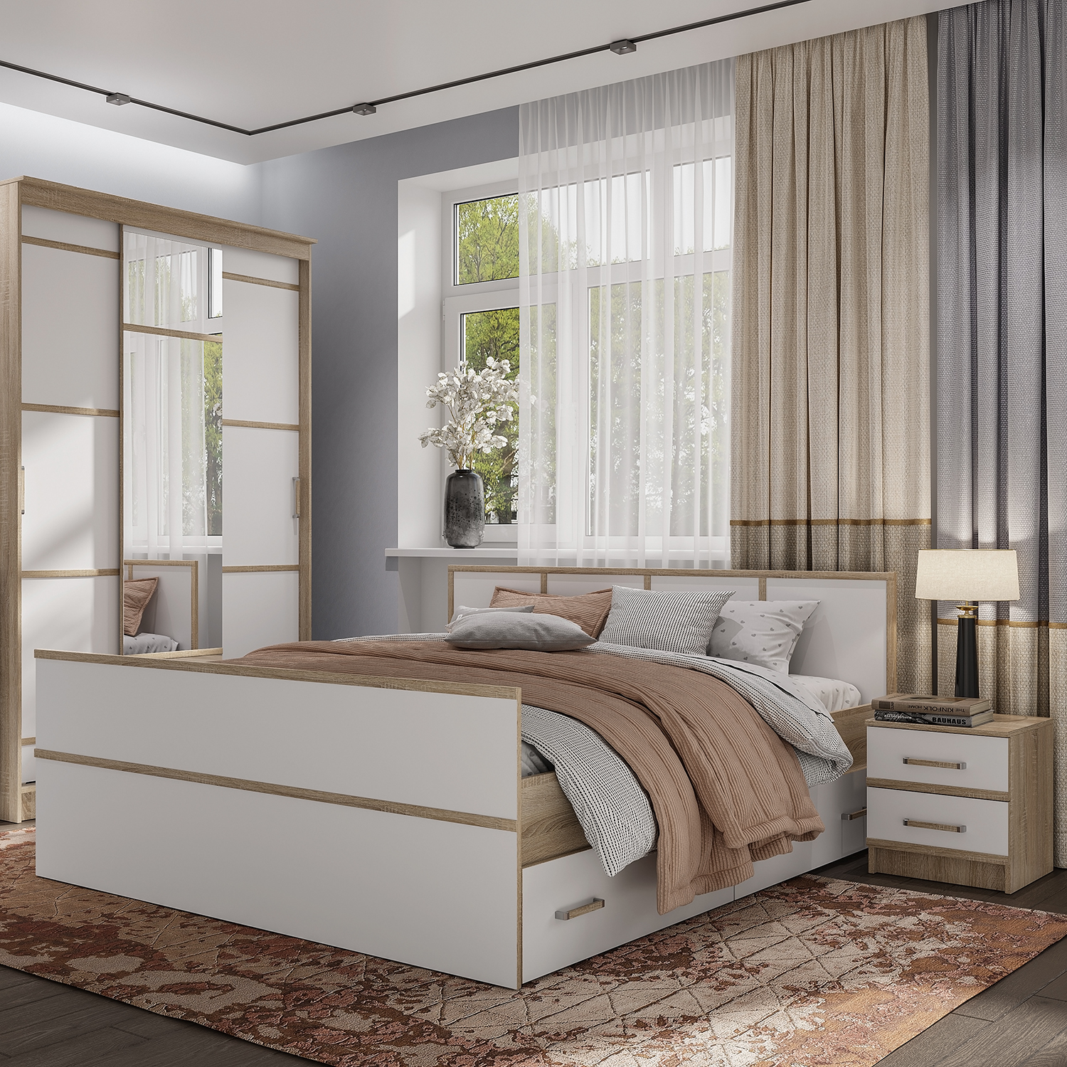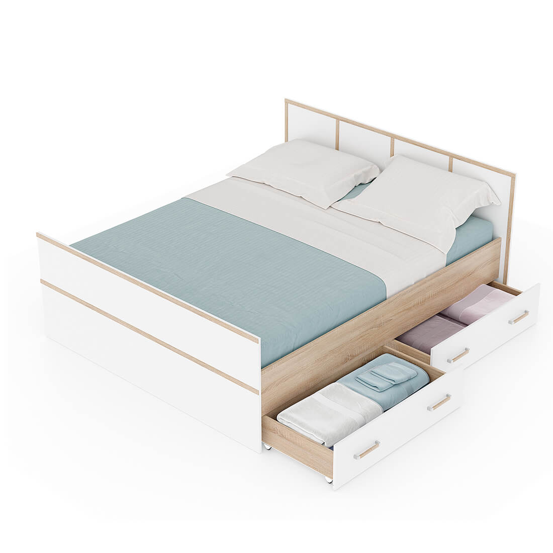 Двуспальная кровать «Сакура» выполнена из ЛДСП высокого качества в контрастных цветах «сонома» и «белый». Данная модель оснащена двумя выдвижными ящиками, в которых можно хранить постельные принадлежности или любые необходимые вещи. Ящики находятся с одной стороны, но установить их можно с любой стороны. Изделие не имеет ножек, а значит избавит вас от скопления пыли под основанием. Данная модель кровати выпускается на фабрике без основания. Основание приобретается дополнительно - проложки Light.
