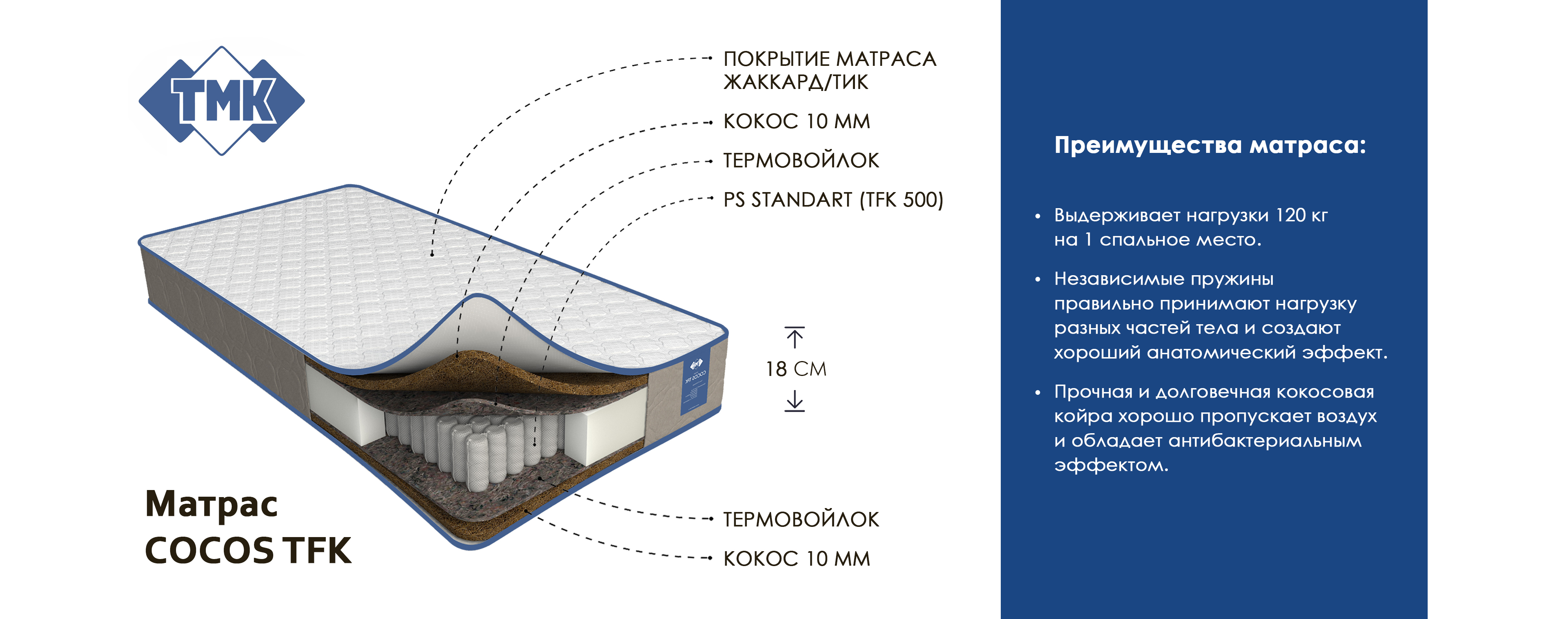 Матрас Cocos – красивый, комфортный и надежный матрас. Он изготовлен из безопасных сертифицированных материалов,
