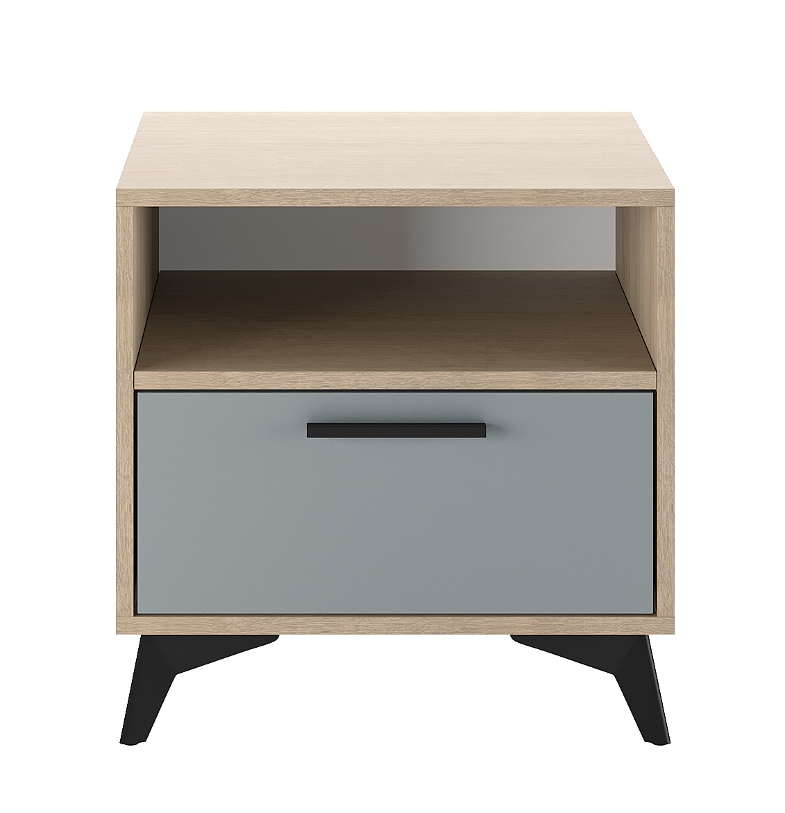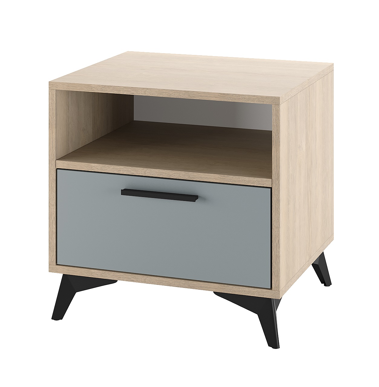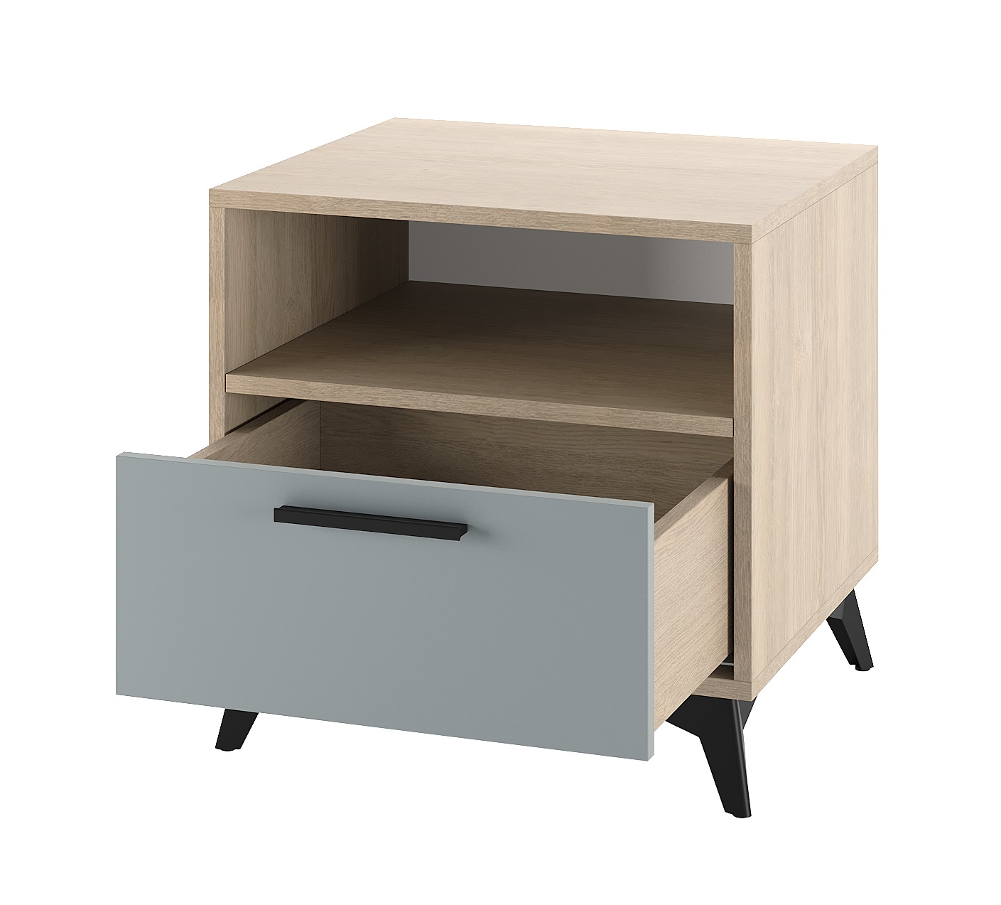 Тумба прикроватная 500 1Я «ЕВА» с ящиком на направляющих скрытого монтажа с доводчиками. Фасад, крышка и лицевой периметр тумбы обработаны кромкой 1 мм. Чёрные металлические ручки и ножки-опоры.