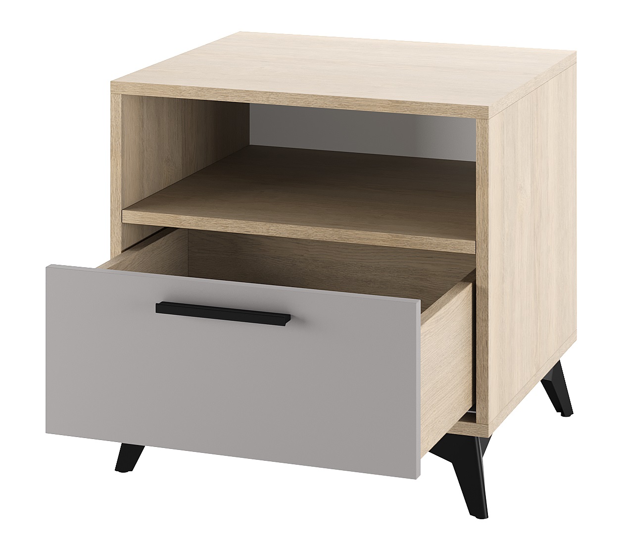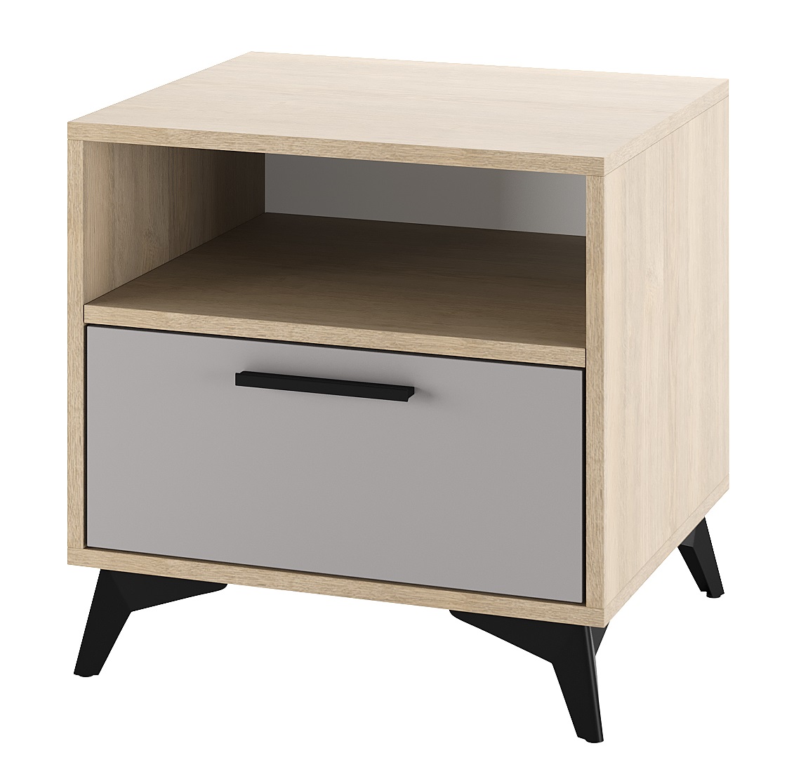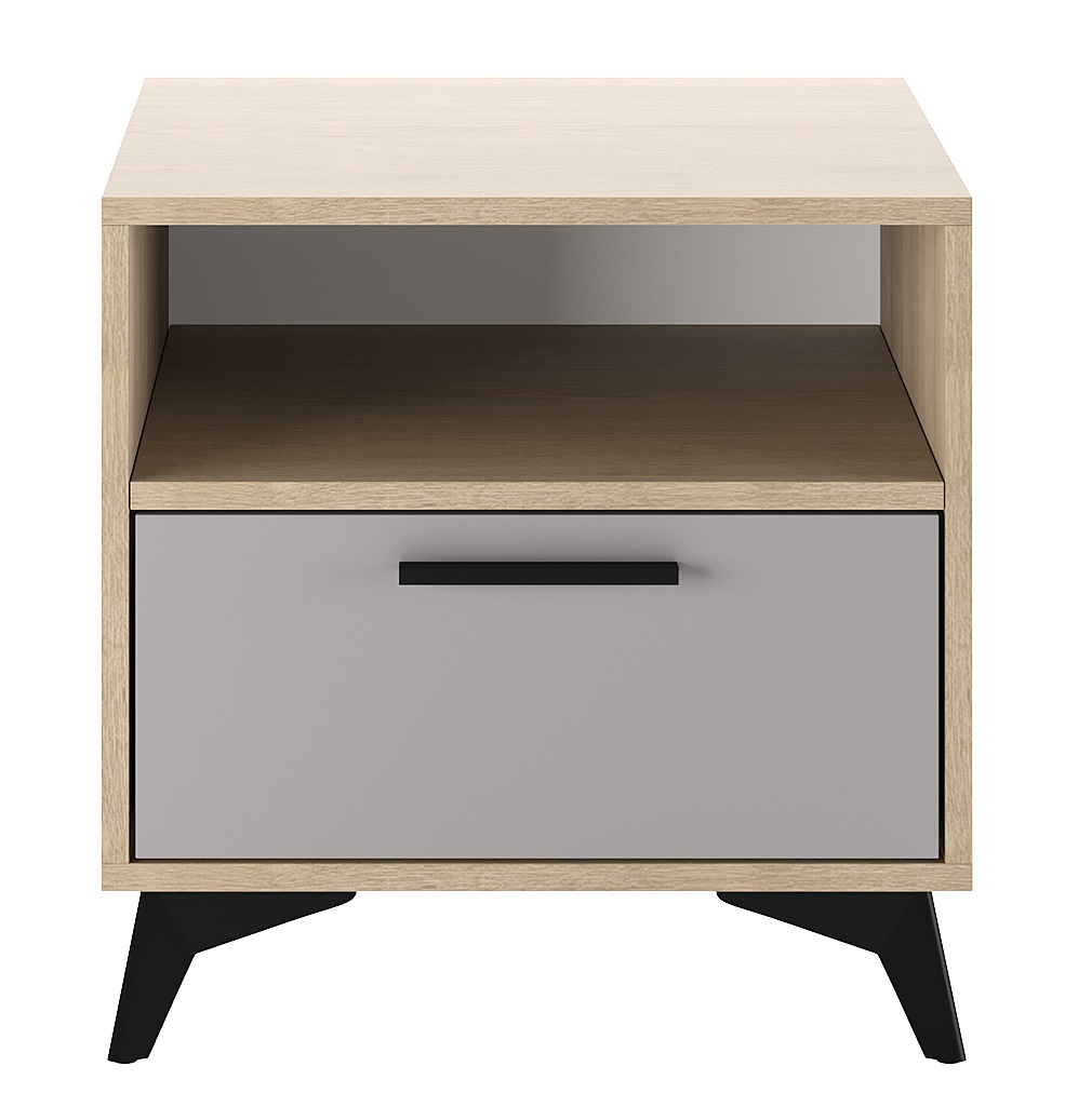 Тумба прикроватная 500 1Я «ЕВА» с ящиком на направляющих скрытого монтажа с доводчиками. Фасад, крышка и лицевой периметр тумбы обработаны кромкой 1 мм. Чёрные металлические ручки и ножки-опоры.