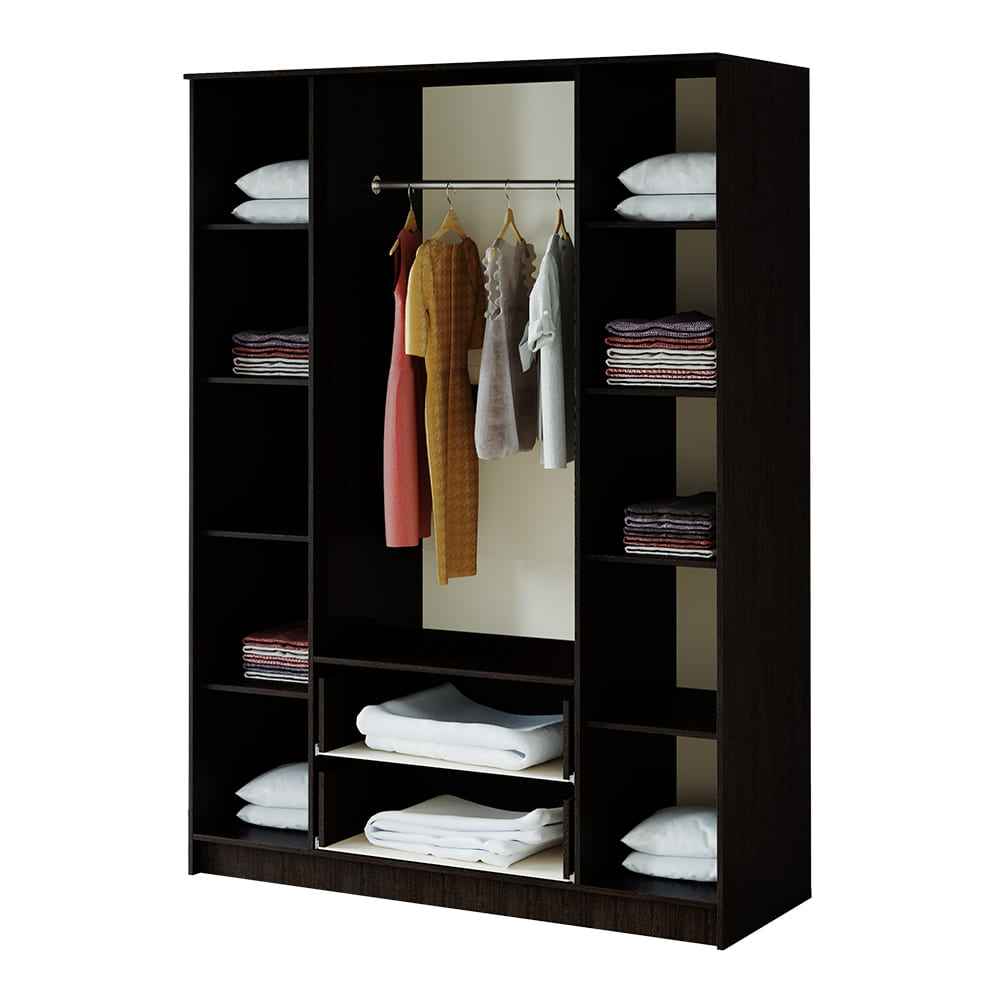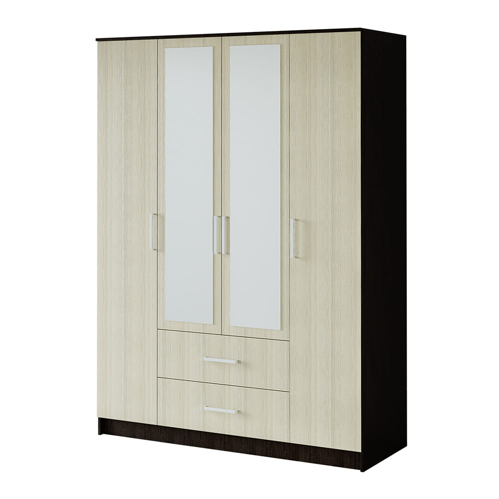Вместительный четырёхстворчатый шкаф Фиеста справится с большим гардеробом и другими вещами. Модель выполнена из качественной ЛДСП. Корпус сделан в темном цвете венге, а фасады – в светлом лоредо. Комплектация представляет собой центральную зону с двумя нижними выкатными ящиками и отделения со штангой для одежды на плечиках. Справа и слева расположились многочисленные полки для вещей. В створки центральных дверок вмонтированы зеркала. Правильный выбор по лучшей цене — это шкаф четырёхстворчатый Фиеста венге