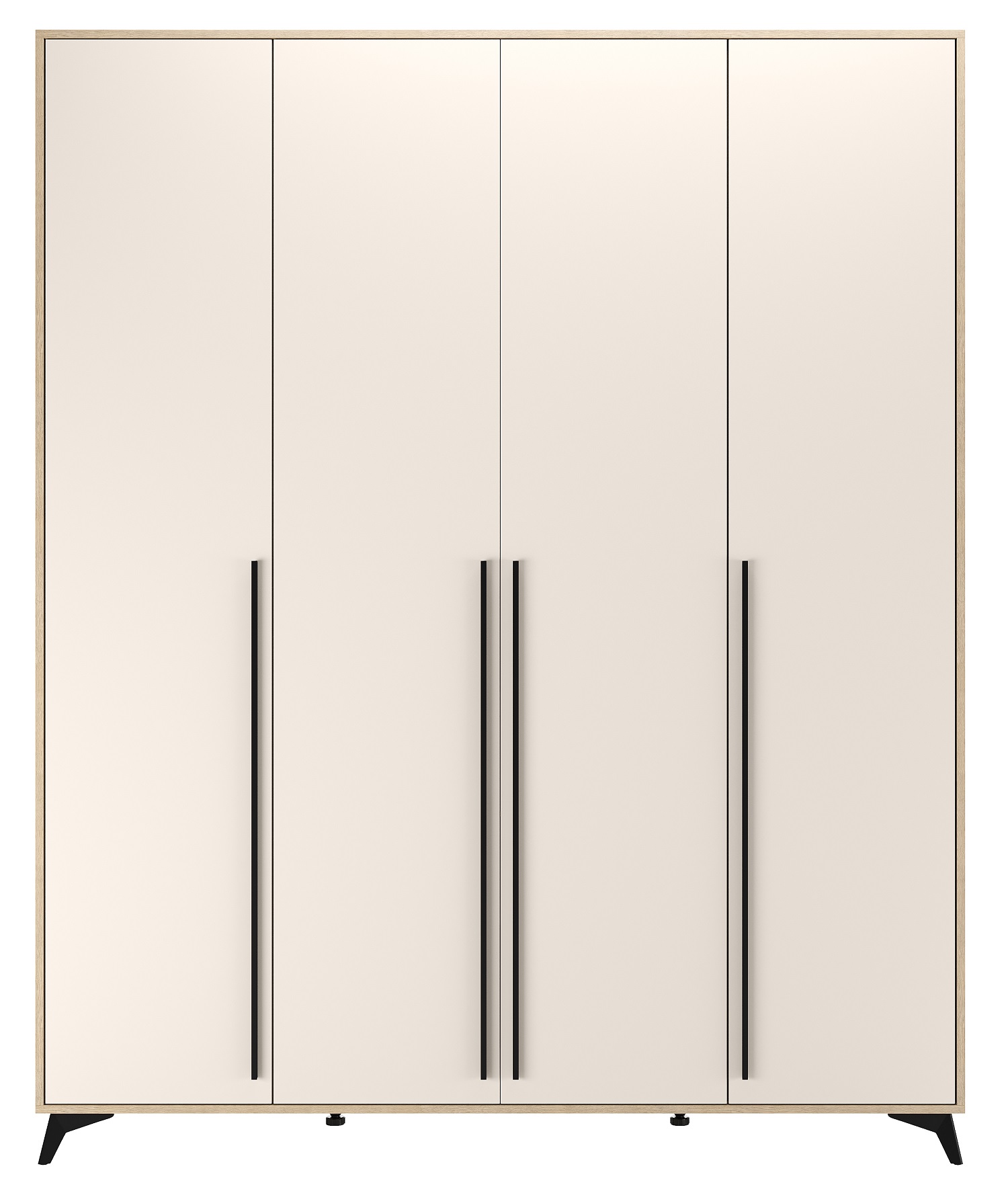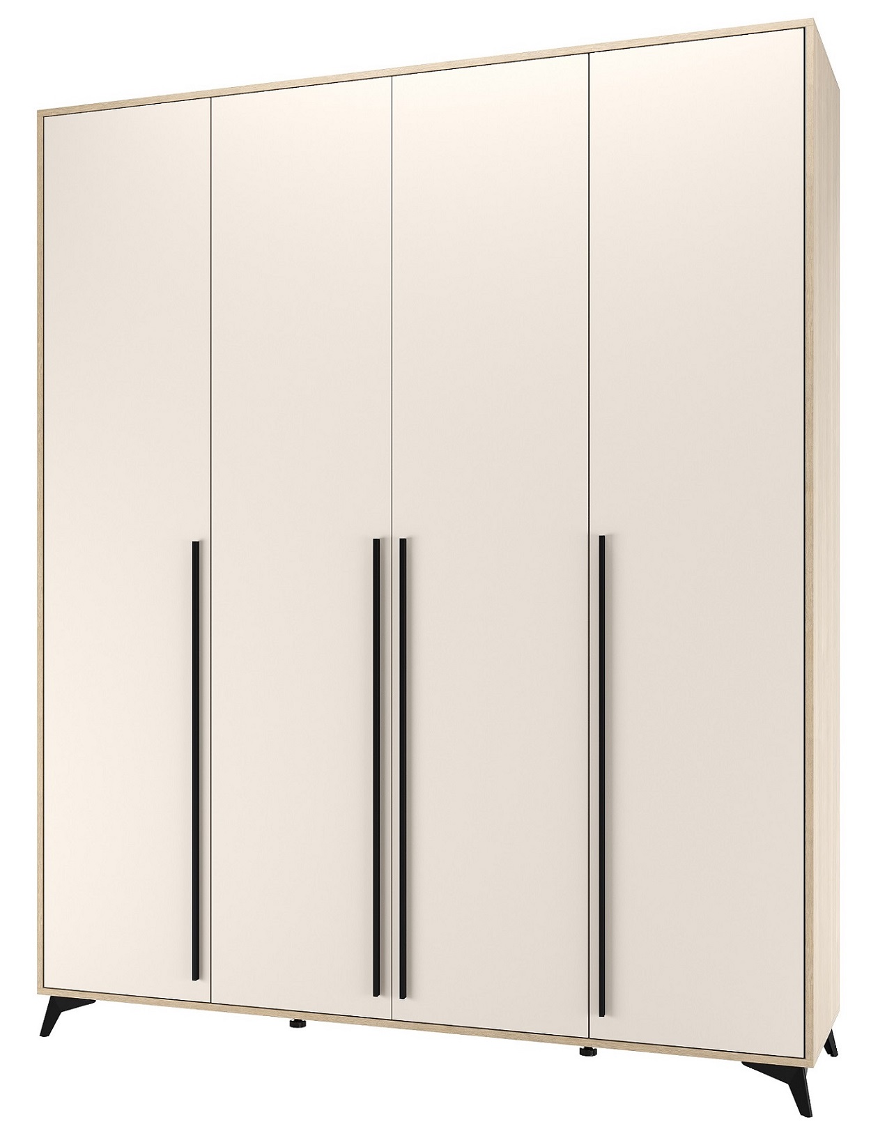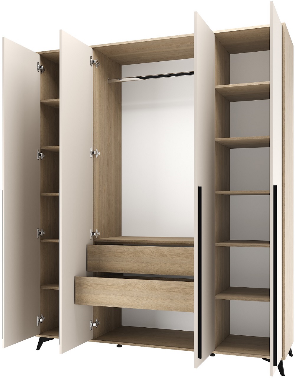 Шкаф 1800 4С2Я «ЕВА» с металлической штангой, полками и ящиками на направляющих скрытого монтажа с доводчиками. Фасады и лицевой периметр шкафа обработаны кромкой 1 мм. Чёрные металлические ручки-рейлинги и ножки-опоры.