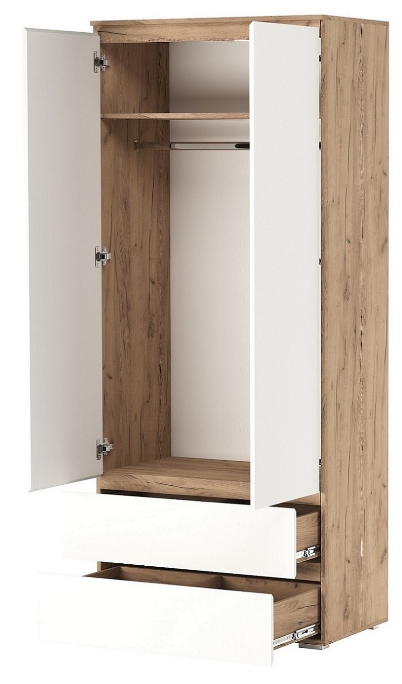 Шкаф 2С2Я «ГРЕТТА» 2-створчатый с 2-мя ящиками на направляющих полного выдвижения, с 2-мя вариантами комплектации шкафа. Стандартная комплектация: с поперечной металлической штангой для верхней одежды. Возможна комплектация полками в качестве дополнительной опции. Применение интегрированной ручки на фасадах делает модель стильной и безопасной – дверцы открываются за профилированные выступы. Фасады обработаны кромкой 1 мм. Чёрная регулируемая ножка-опора