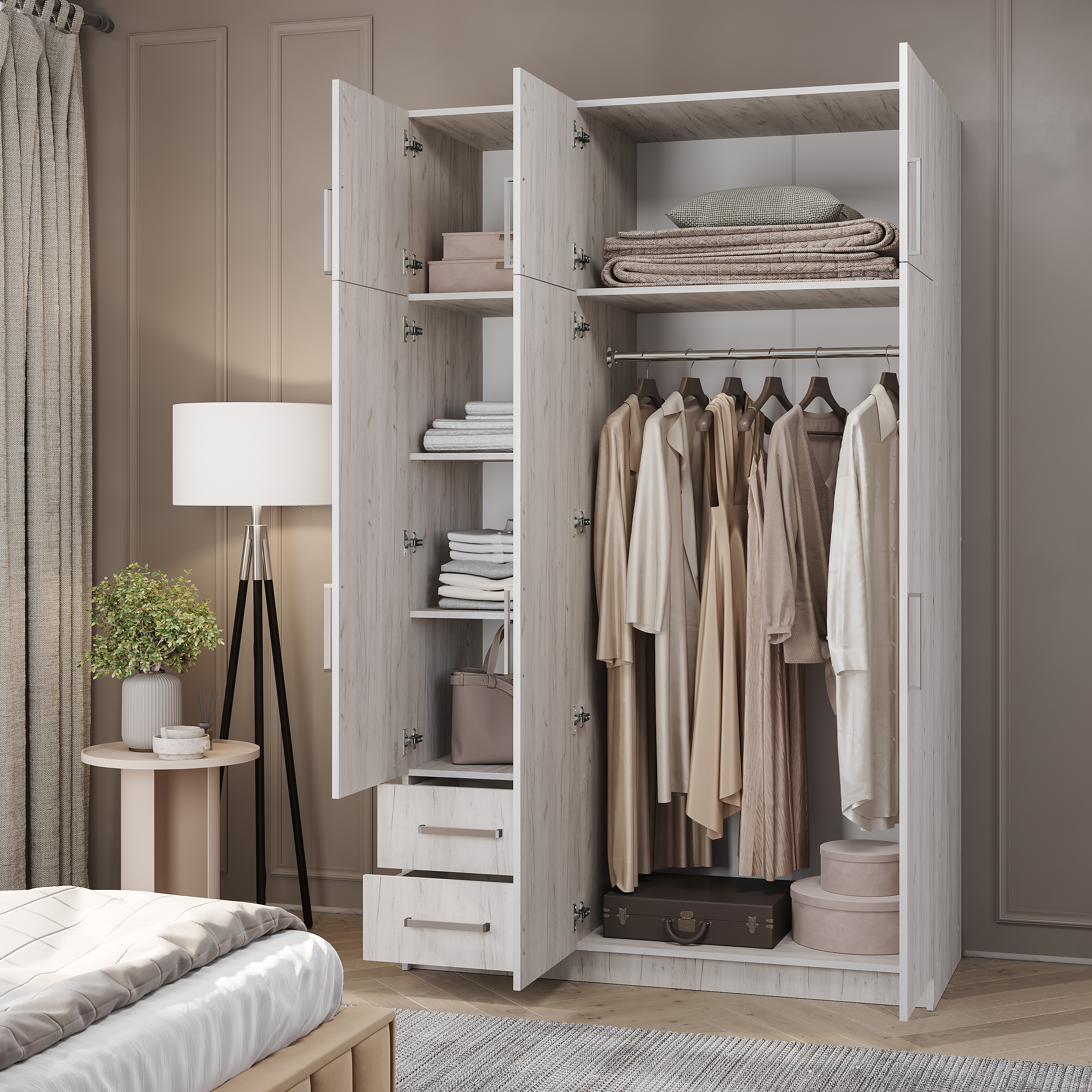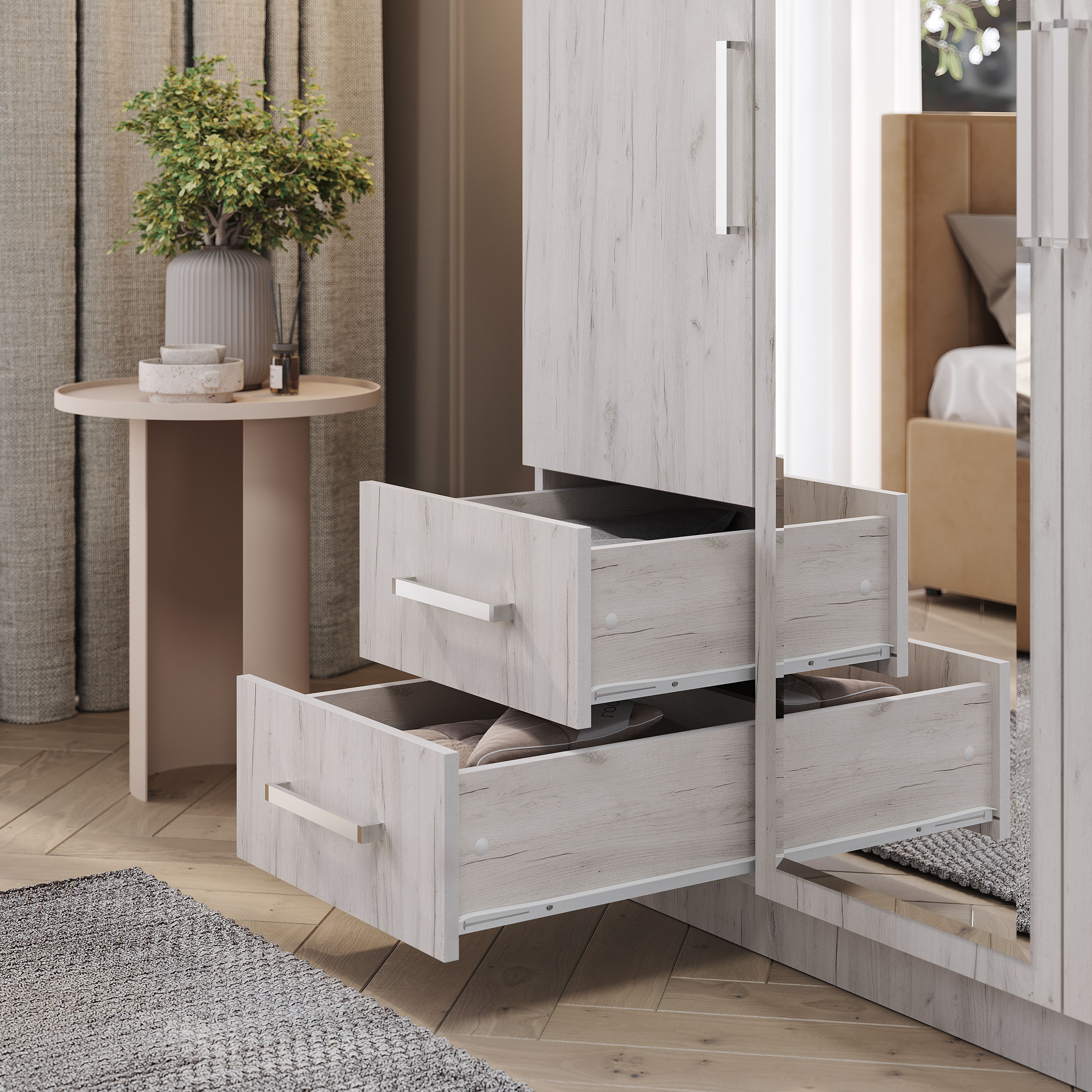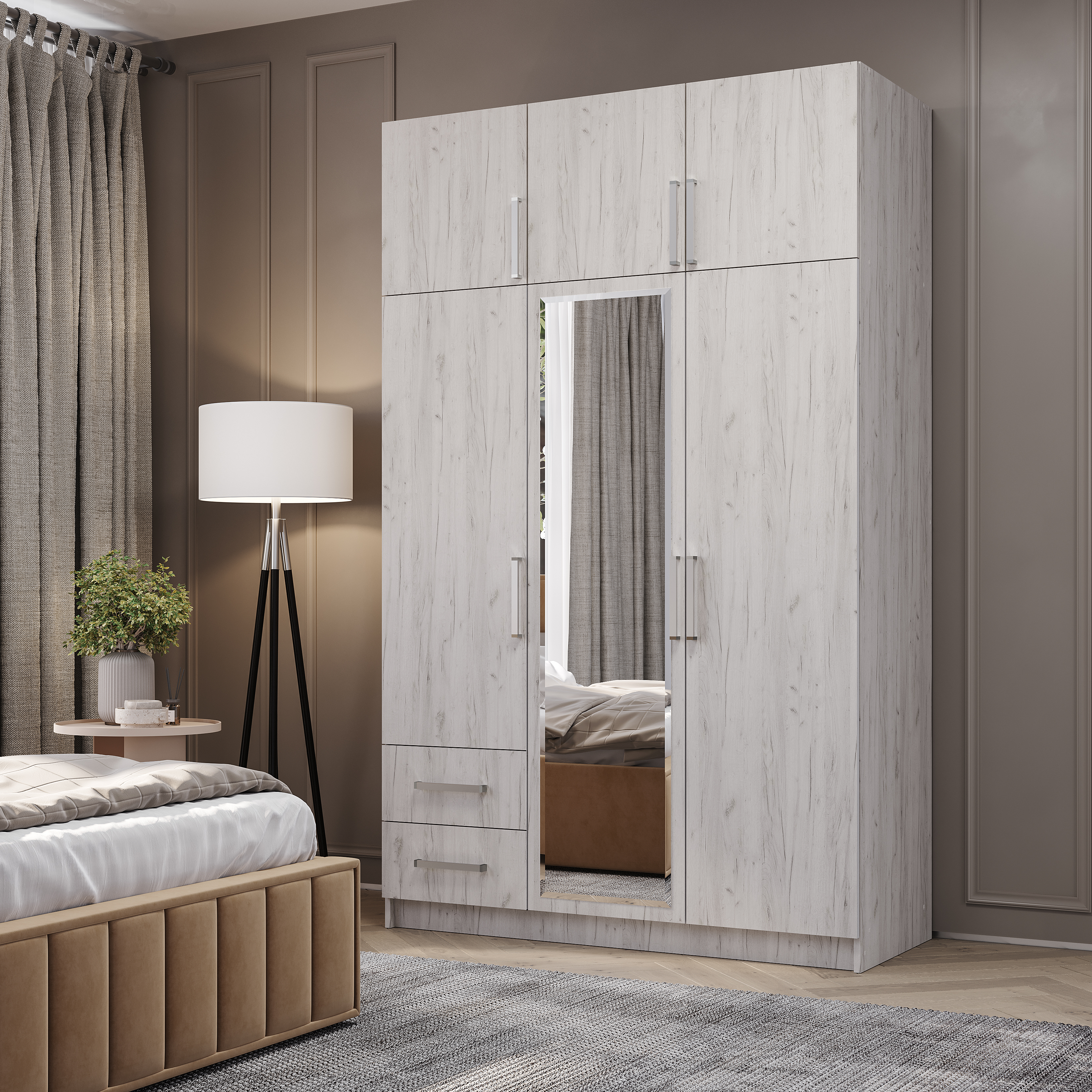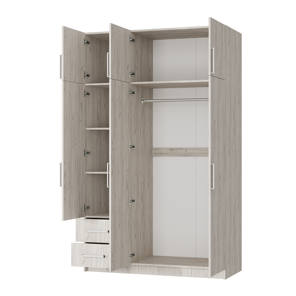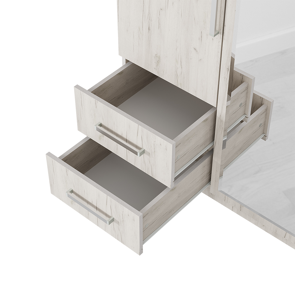 Очень вместительная модель трехстворчатого шкафа с ящиками будет прекрасно смотреться в вашей спальне. Изделие состоит из нескольких зон для хранения одежды и обуви, включая два выдвижных ящика для мелких вещей, отделение для одежды на вешалках и вместительные полки. В центральную створку вставлено зеркало, что помимо основной функции, позволяет визуально расширить пространство.