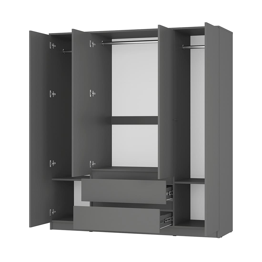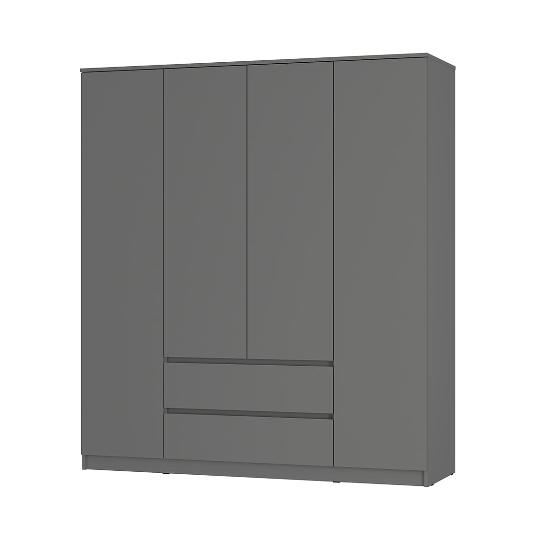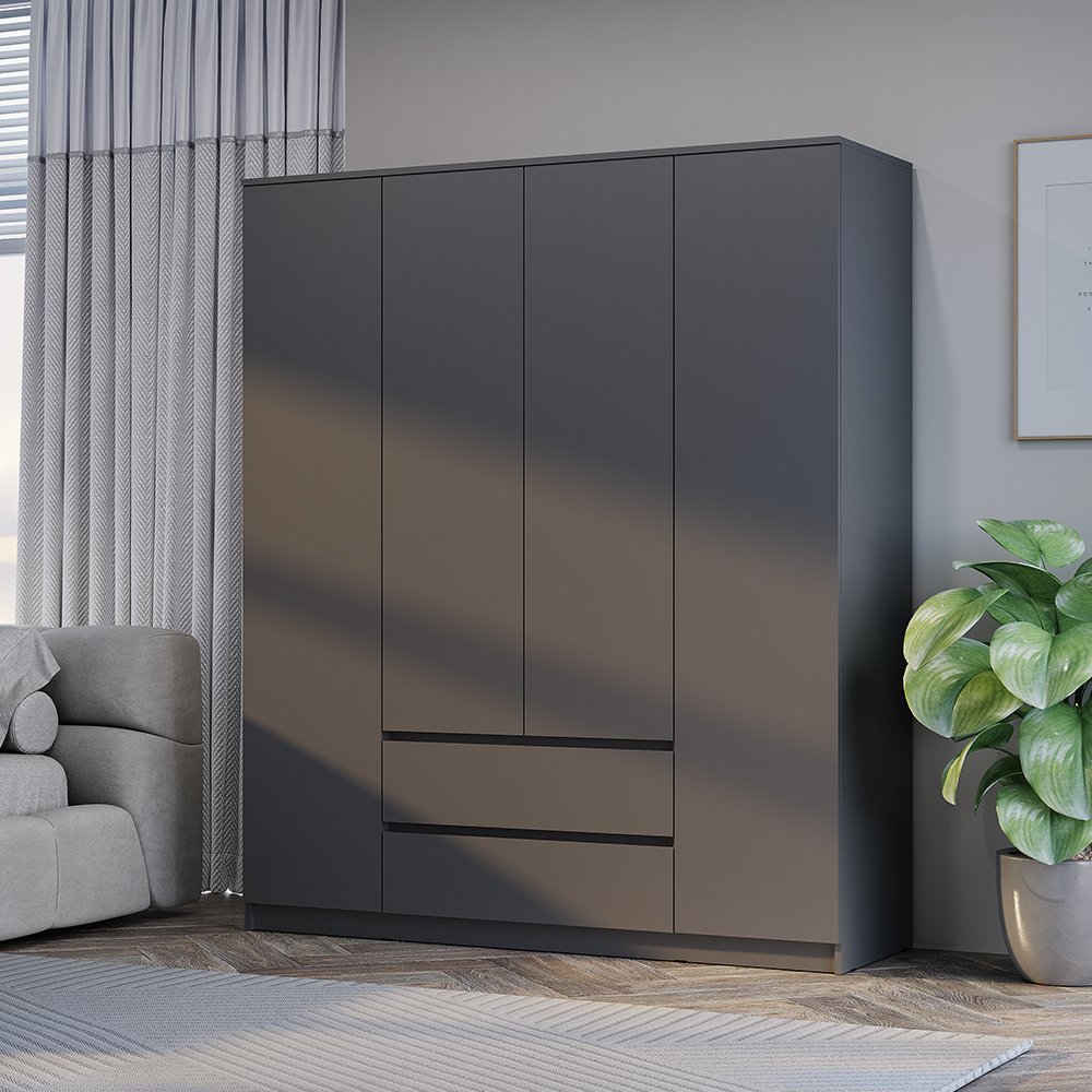 Шкаф 4-створчатый «Симпл» (ШК-13) — идеальная модель для семьи и для тех, кто предпочитает хранить гардероб в одном месте. Простой и вместительный четырехстворчатый шкаф оснащен двумя вместительными выдвижными ящиками, в которых удобно хранить обувь и постельное белье. В центральной части шкафа можно разместить сезонный гардероб, а в боковых отделах — верхнюю одежду. Максимальная нагрузка на полку - 10 кг, на штангу - 10 кг, на ящик - 5 кг. «Симпл» - это современная коллекция функциональной мебели. В ней собраны все необходимые предметы для интерьера спальни, гостиной и личной комнаты: шкафы, кровати, комоды, столы, тумбы. Также в состав композиции входят малые формы, которые станут изюминкой вашего дома. Коллекция полностью соответствует своему названию. Простой и стильный дизайн, отсутствие лицевой фурнитуры, распашные створки на отталкивателях (кроме тумбы ТБ-06 и тумбы ТБ-19) покорит ценителей минимализма. Мебель, выполненная в спокойных оттенках «белый» и «графит», идеально дополнит как классический, так и современный интерьер. Коллекция отличается практичностью и функциональностью. Полноценный набор мебели позволяет экспериментировать с пространством. Ещё одна особенность коллекции заключается в уникальной фрезеровке торцов фасадов - она выполнена под углом 45 градусов. Благодаря этой детали образовывается удобная интегрированная ручка, которая делает использование мебели более комфортным. Мебель этой коллекции оснащена надежными опорами из безопасного пластика – это позволит не только комфортно проводить влажную уборку, но и уберечь напольное покрытие от повреждений.
