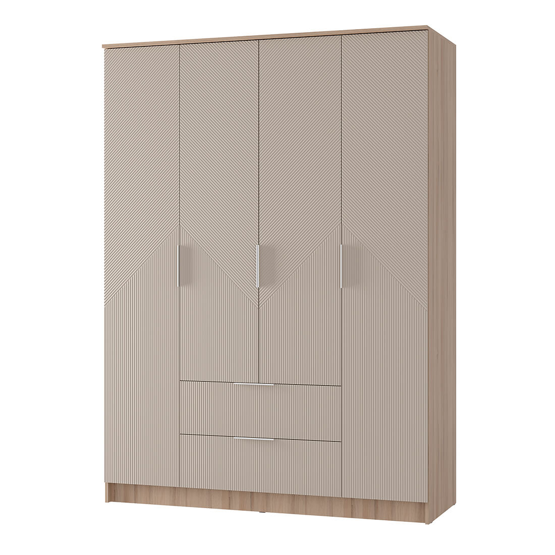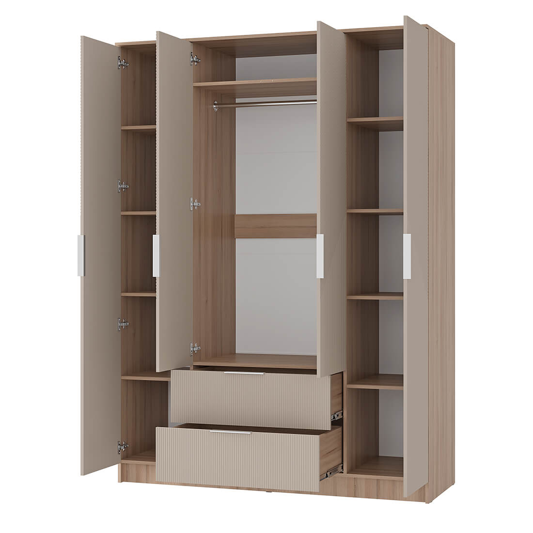 Шкаф четырёхстворчатый (ШК-11) имеет пять удобных полок по бокам для хранения одежды. Помимо этого, по центру расположены две вместительные секции для хранения ежедневной одежды. В нижней части шкафу находятся два вместительных ящика — это идеальное место для хранения обуви или постельного белья.