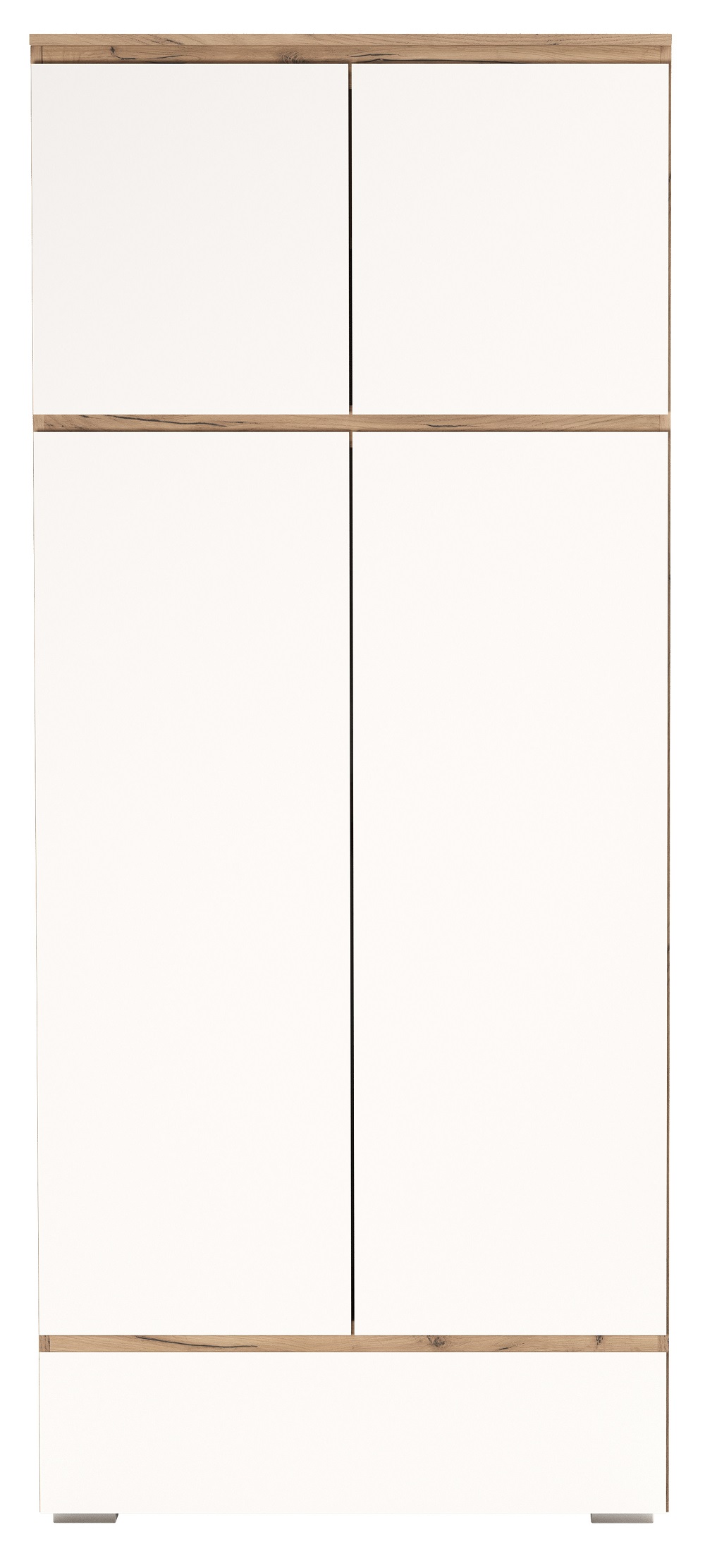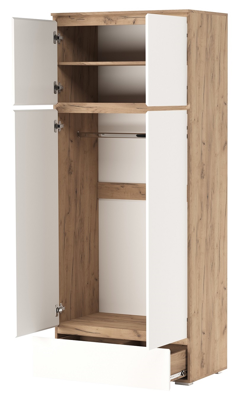 Шкаф 4С1Я «ГРЕТТА» 4-створчатый с ящиком на направляющих полного выдвижения, с поперечной металлической штангой для верхней одежды, с полками. Применение интегрированной ручки на фасадах делает модель стильной и безопасной – дверцы открываются за профилированные выступы. Фасады обработаны кромкой 1 мм. Чёрная регулируемая ножка-опора.