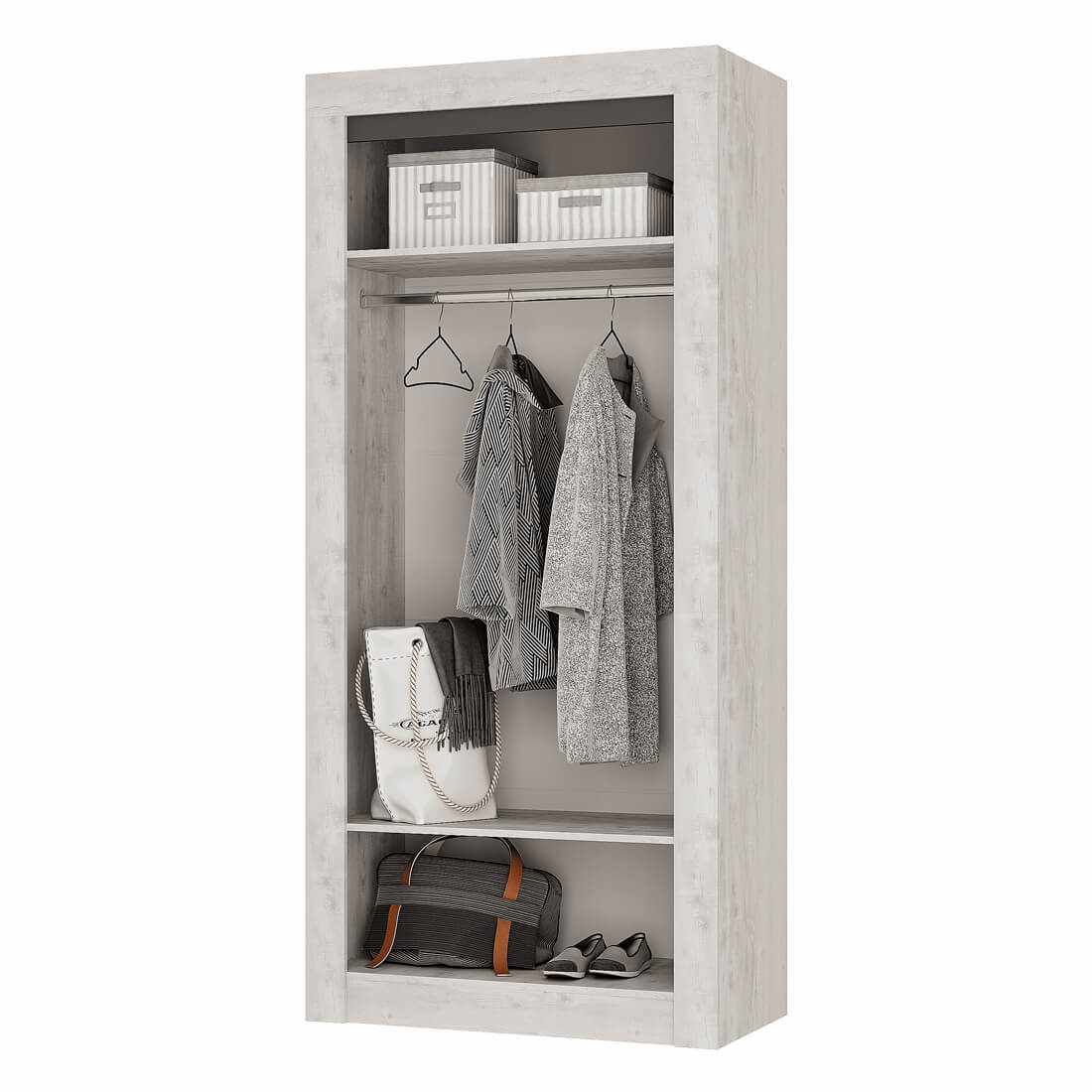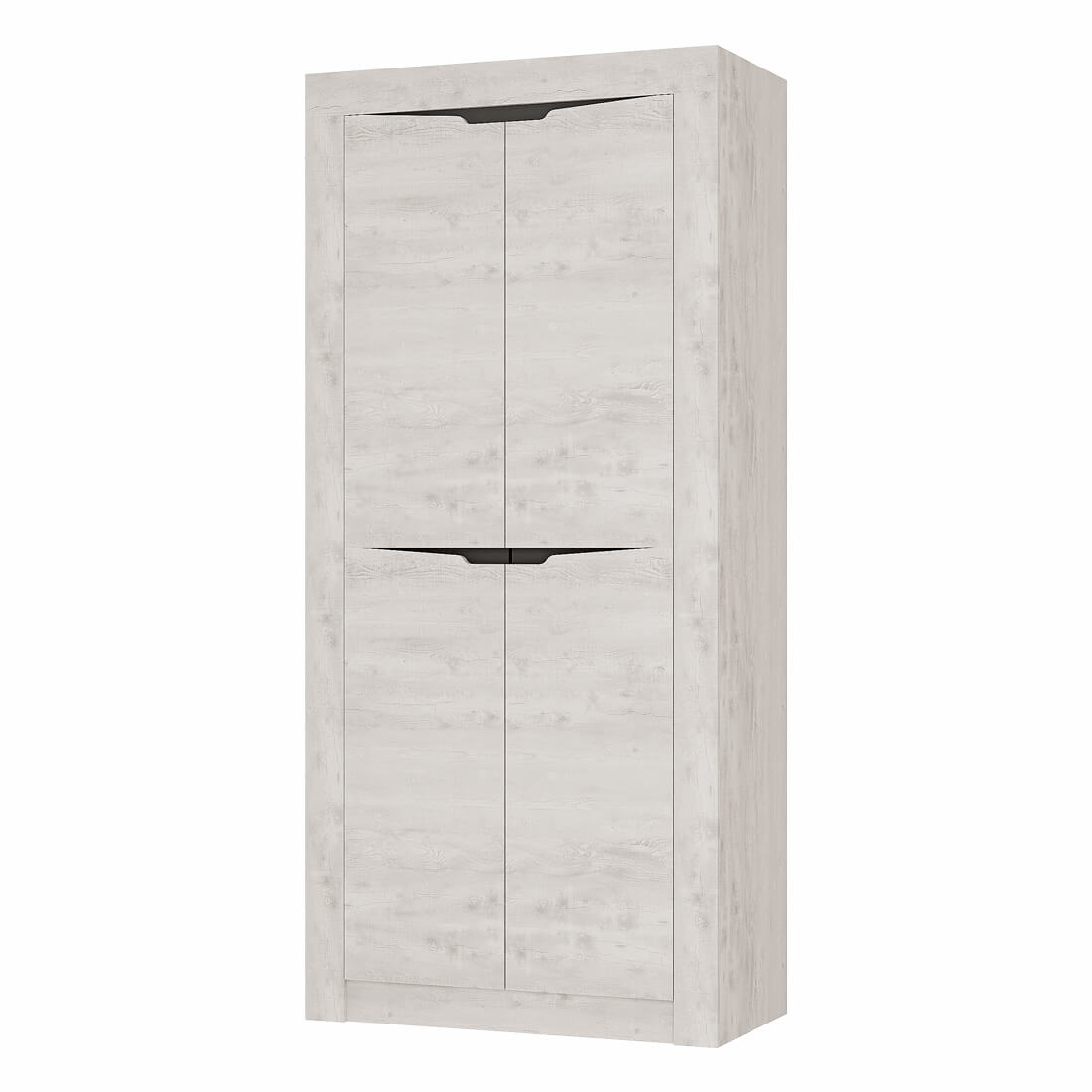Двустворчатый распашной шкаф «Леонардо» с просторной антресольной полкой для хранения головных уборов, горизонтальной хромированной штангой для плечиков и нижней полкой, в которой удобно хранить коробки с обувью, выдержан в общей стилистики коллекции. Сборка универсальна.
