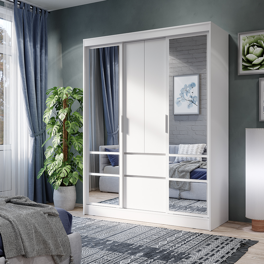 Шкаф оснащен удобными ящиками и полками, а также пространством для вертикального хранения вещей.