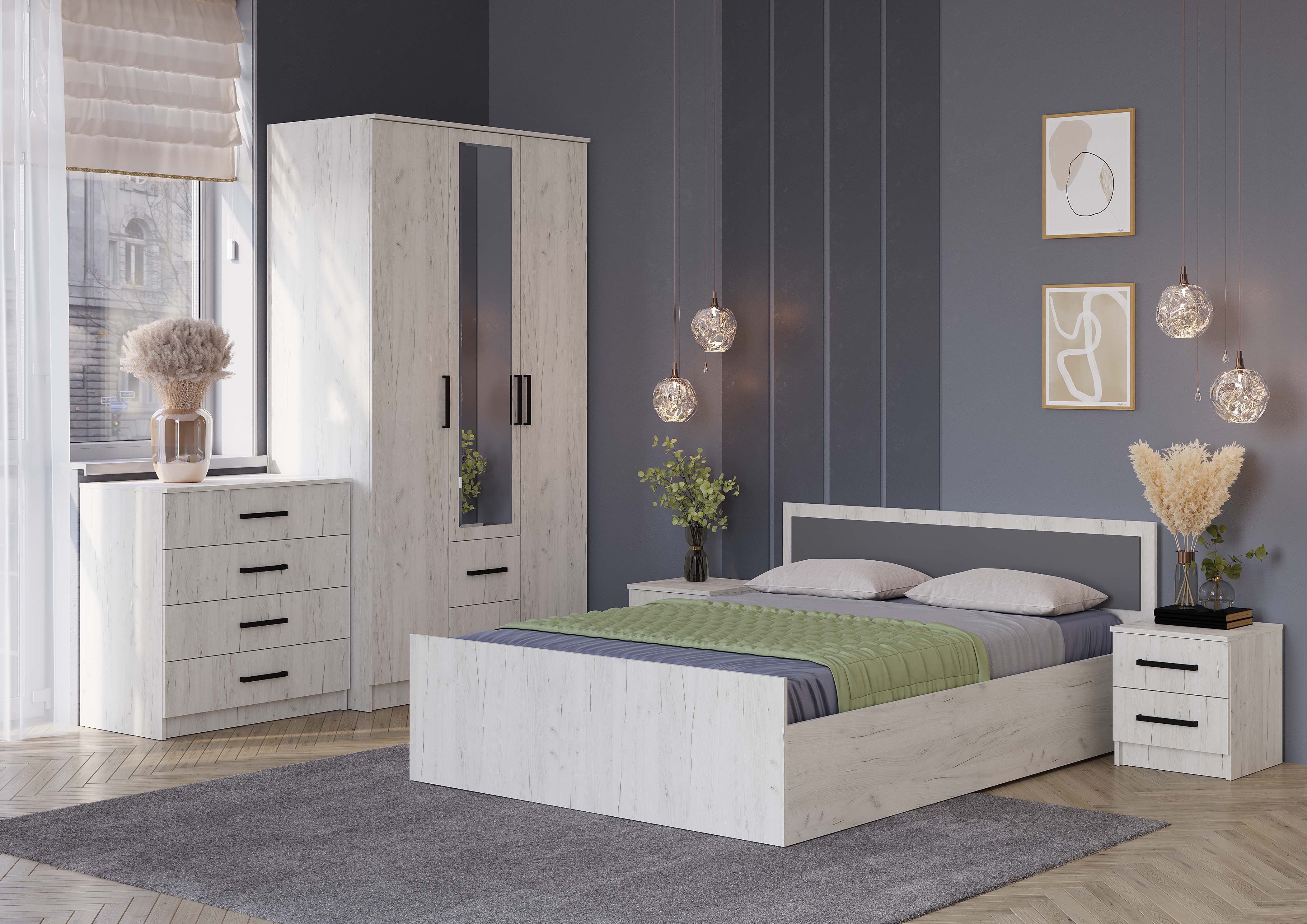 «Фиеста» - это стильная и универсальная коллекция мебели, которая включает в себя все необходимые предметы для обустройства комнаты. Светлый, трендовый оттенок «дуб крафт белый» создает атмосферу легкости и тепла. Накладные ручки контрастного цвета не только облегчают повседневное использование, но и являются стильным акцентом. Изголовье кровати декорировано накладкой в цвете «графит», что придает дополнительную особенность и шарм этой коллекции.