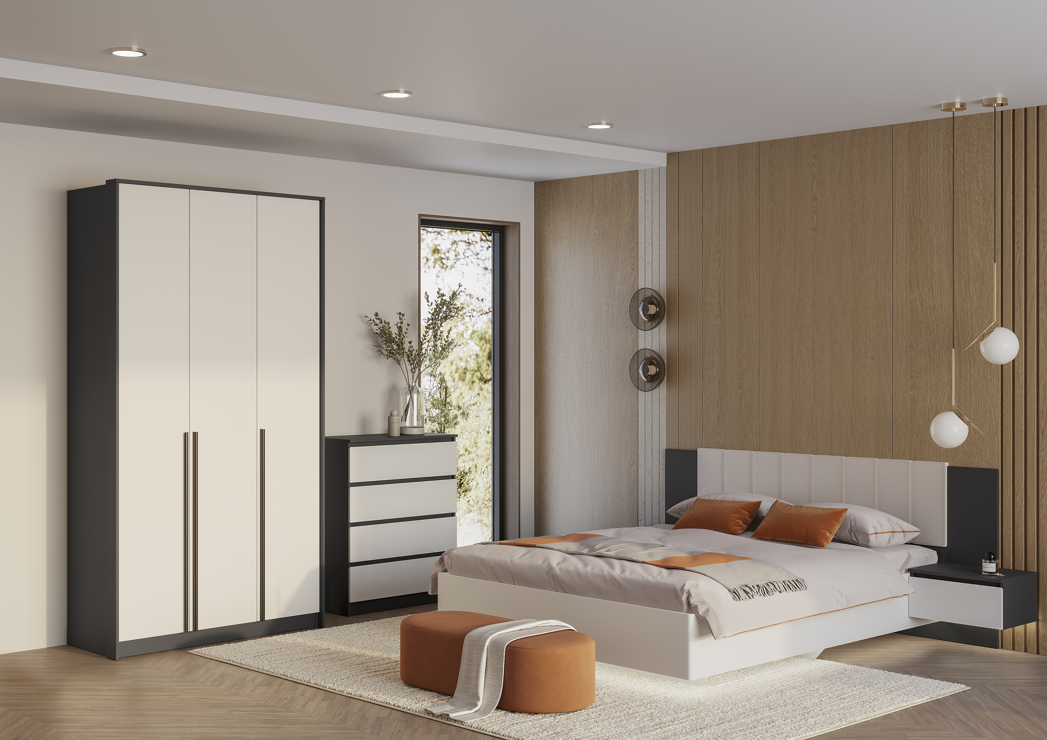 Коллекция «Шарм» - современная классика в контрастном исполнении «белый/графит». Кровать с парящим эффектом и мягким изголовьем в трендовой ткани «барашек» - сердце коллекции. Шкафы (3-х и 4-х створчатый) обретают массивность благодаря монолитным ЛДСП-порталам, дополнены вертикальными черными ручками и надежными петлями с доводчиками. Комод воплощает чистый минимализм: гладкие фасады (без фурнитуры) и плавные шариковые направляющие. Парящие тумбы крепятся к изголовью, сохраняя стены безупречными. Элегантность, функциональность и защита интерьера.