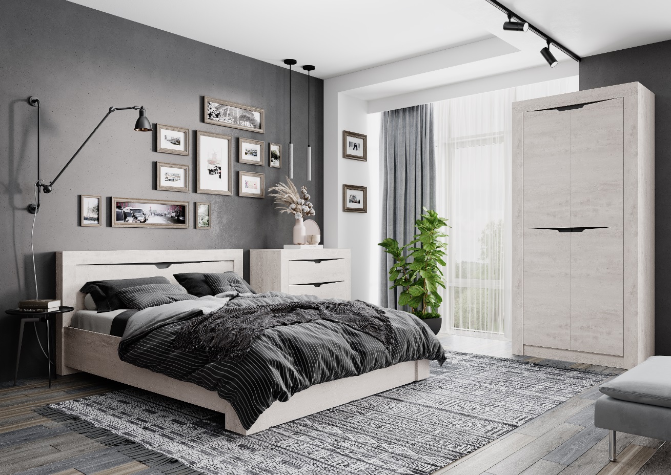 Спальный гарнитур «Леонардо» прекрасно впишется в любой современный интерьер. В комплекте есть всё необходимое для обустройства пространства: широкая кровать и коллекция модулей для хранения одежды, аксессуаров и постельных принадлежностей.