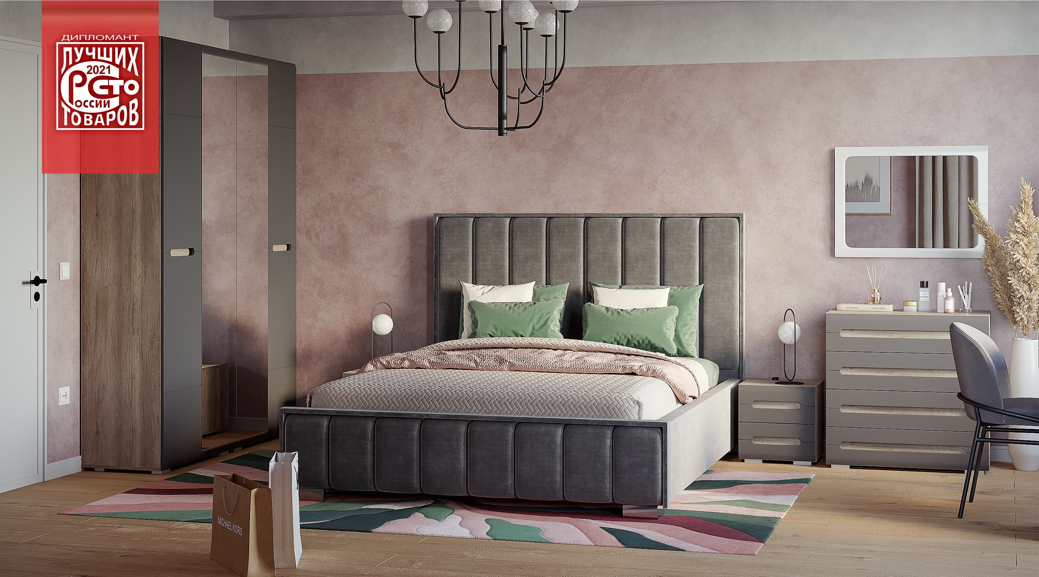 В состав композиции №3 входят: кровать Наоми КР-11 1,6 м F24, две прикроватных тумбы Наоми ТБ-15 1 шт. F24, два шкафа распашных Наоми ШК-22 F24, комод Наоми КМ-09 F24 и зеркало Наоми З-03 F24.